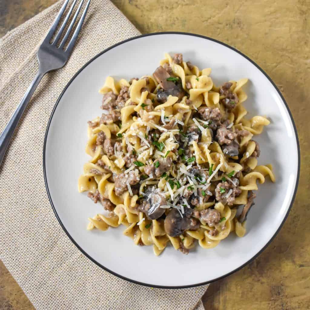 This easy ground beef stroganoff is a weeknight dinner hero. It comes together quickly and makes a fantastic meal the entire family will enjoy. In this recipe, ground beef, white button mushrooms, and onions are cooked in a delicious creamy sauce and combined with tender egg noodles.
