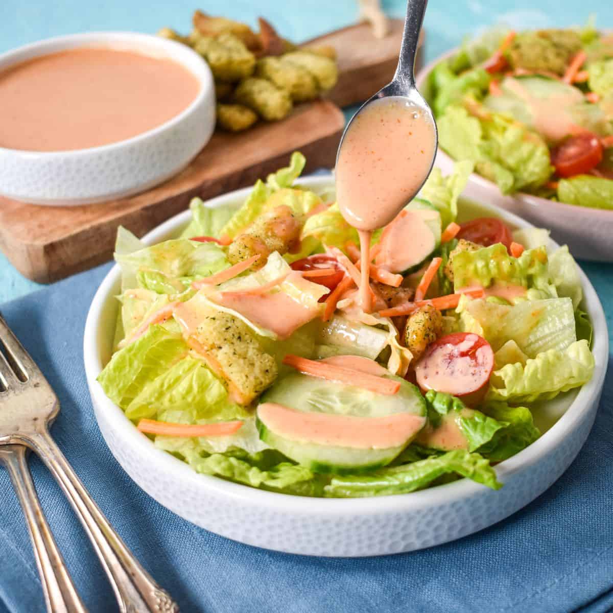 We serve our dressing on a simple salad made with romaine and iceberg lettuce, sliced English cucumbers, cherry tomatoes, shredded carrots, and seasoned croutons. It also makes a great spread for burgers, sandwiches, and wraps, or a dip for carrot sticks, cucumbers, and other fresh vegetables.